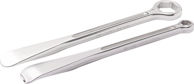 Second wrench has hex box wrench for 24 mm axle nuts on other end