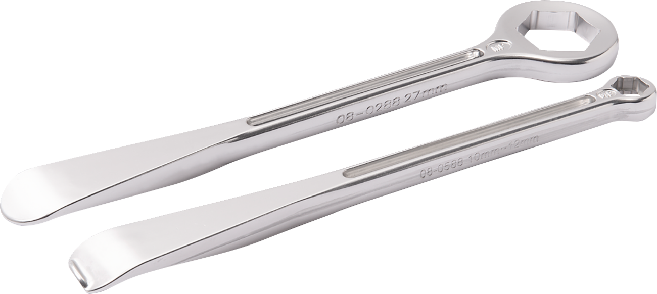 One lever has unique combination stepped 10/12 mm box end wrench on other end for turning rim lock nuts