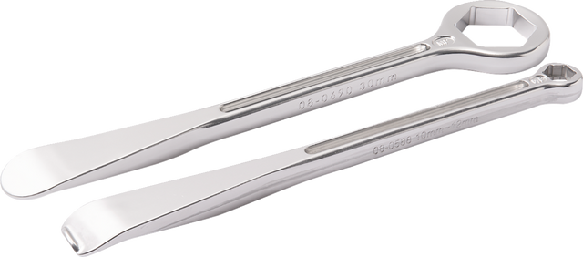 Second wrench has hex box wrench for 30 mm axle nuts on other end
