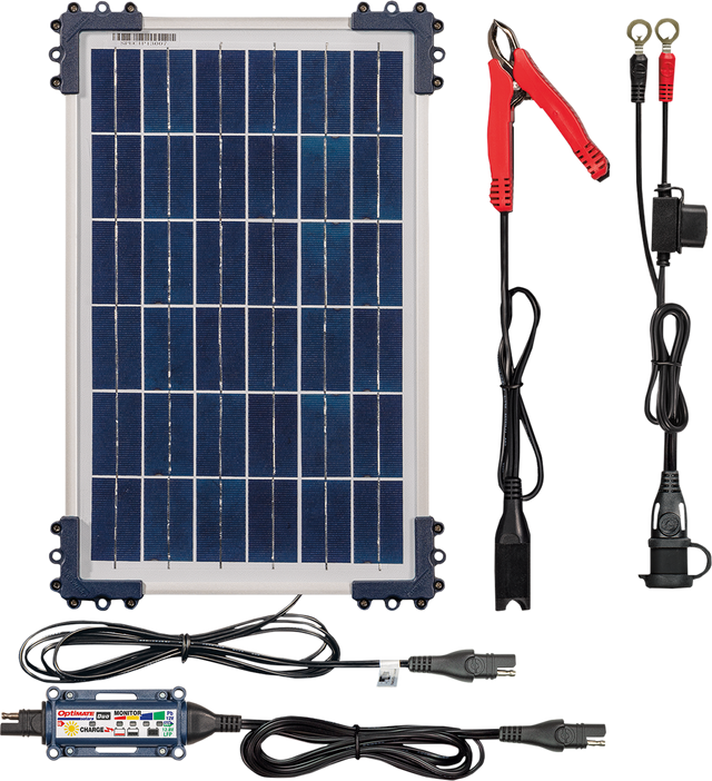 Includes a 10W weatherproof solar panel and a smart OptiMate Solar combination charger-monitor controller that charges & maintains a 12V battery during the day and monitors and displays the battery state of charge at night