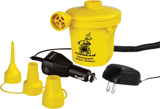 This rechargeable 12 volt air pump is small, convenient and versatile. It comes equipped with a 120 volt AC charger and a 12 volt charger that plugs into cigarette lighters
