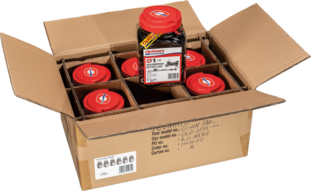 Quick-connect permanent battery lead with weather-protected connection system and cable, delivered in 6 jars containing 20 pcs each.