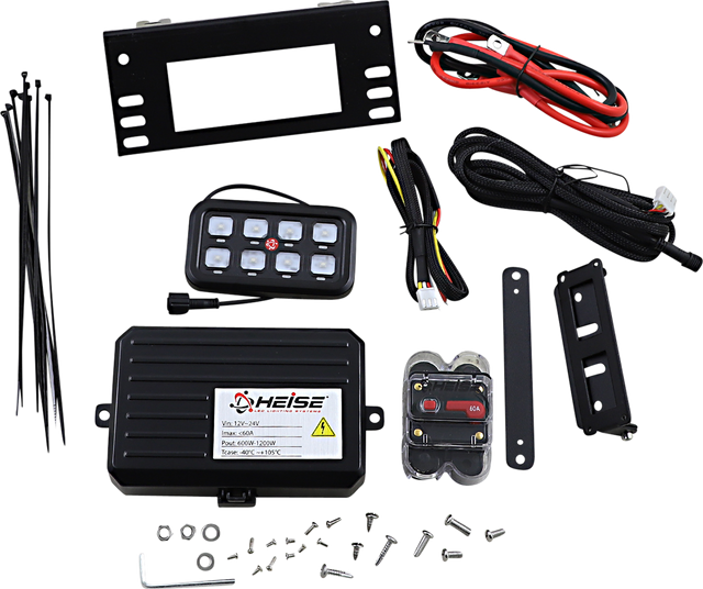 Includes six extra fuses, 60 amp resettable circuit breaker, power harness and battery cables, two switch panel brackets, one control box bracket, mounting hardware and dash illumination control wire