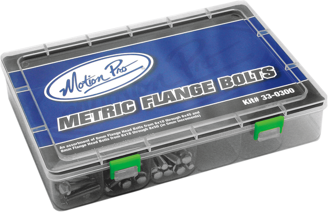 An assortment of 6 mm flange-head bolts from 6 x 10 through 6 x 45 and 8 mm flange-head bolts from 8 x 16 through 8 x 50 in packs of 10