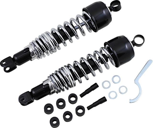 Feature a glossy black body and short upper shroud with dual chrome springs upper collar and stepped pre-load adjuster