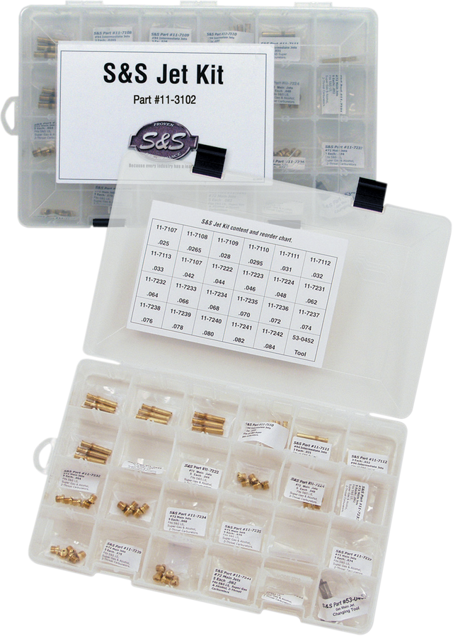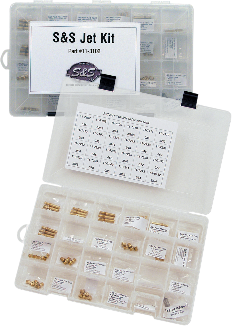 Includes 3 each of all intermediate jets (except .036 and .040), 5 of of each of all main jets (except .050, .052, .054, .056, .058 and .060) and a main jet tool
