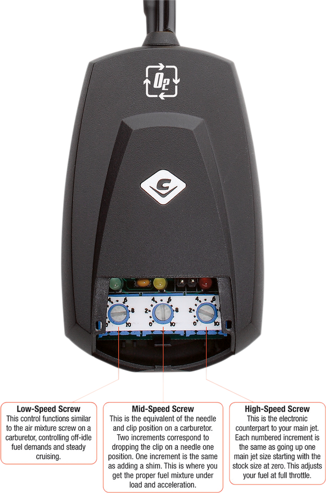 Works much like a carburetor jet kit with adjustments similar to the air-mixture screw, the needle and clip positions and the main jet