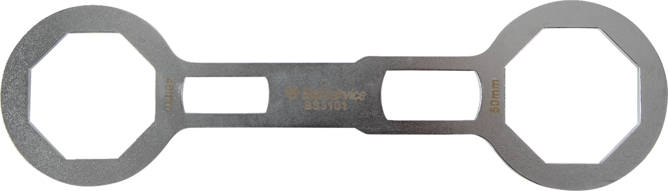 8 point of dual size wrench for adjustment or removal of the fork cap (cartridge) on dual chamber closed cartridge forks