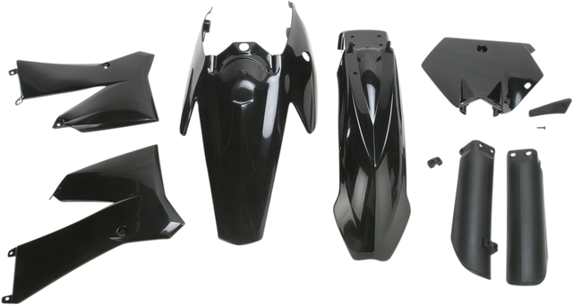 Full kit includes front fender, front number plate, lower fork cover set, radiator shrouds, side panels, and rear fender