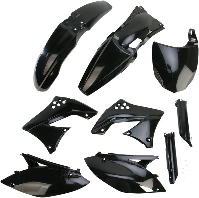 Full kit includes front fender, front number plate, lower fork cover set, radiator shrouds, side panels, and rear fender