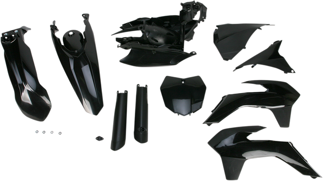 Full kit includes front fender, front number plate, lower fork cover set, radiator shrouds, side panels, and rear fender