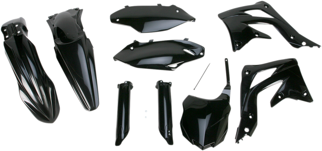 Full kit includes front fender, front number plate, lower fork cover set, radiator shrouds, side panels, and rear fender