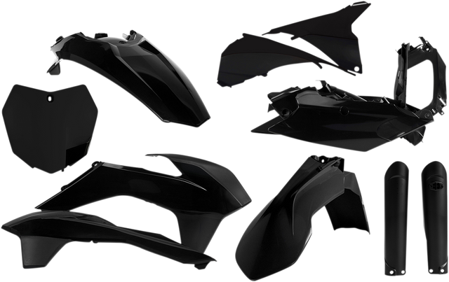 Full kit includes front fender, front number plate, lower fork cover set, radiator shrouds, side panels, and rear fender
