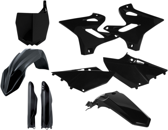 Full kit includes front fender, front number plate, lower fork cover set, radiator shrouds, side panels, and rear fender