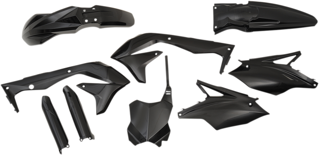 Full kit includes front fender, front number plate, lower fork cover set, radiator shrouds, side panels, and rear fender
