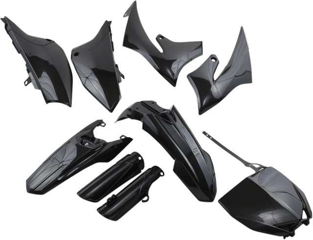 Full kit includes front fender, front number plate, lower fork cover set, radiator shrouds, side panels, and rear fender