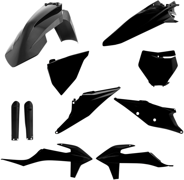 Full kit includes front fender, front number plate, lower fork cover set, radiator shrouds, side panels, and rear fender