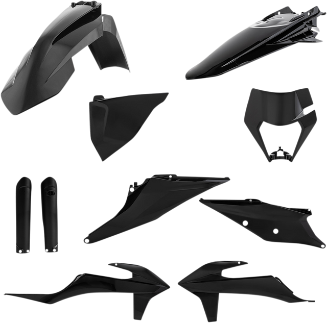 Full kit includes front fender, front number plate, lower fork cover set, radiator shrouds, side panels, and rear fender