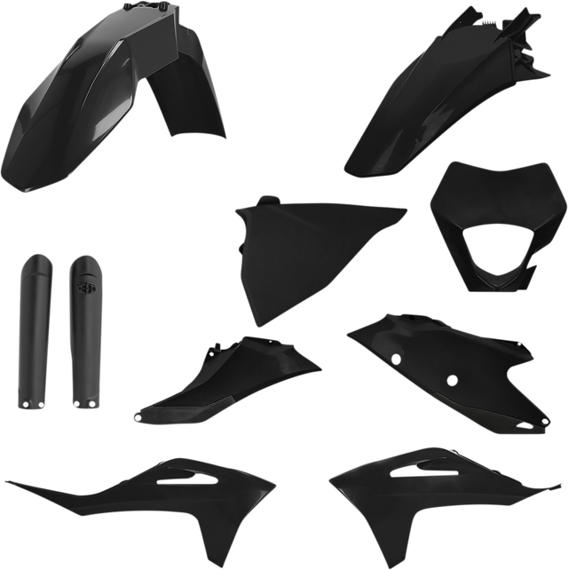 Full kit includes front fender, front number plate, lower fork cover set, radiator shrouds, side panels, and rear fender