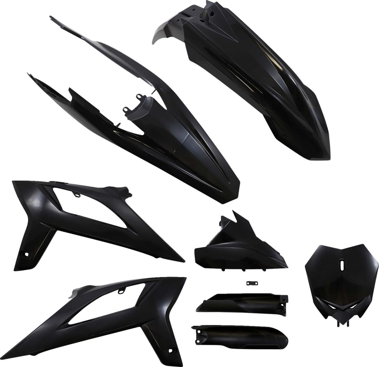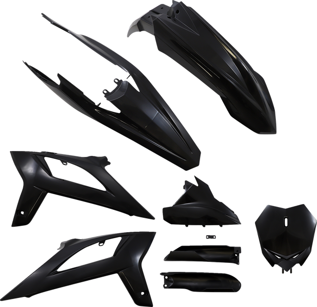 Full kit includes front fender, front number plate, lower fork cover set, radiator shrouds, side panels, and rear fender