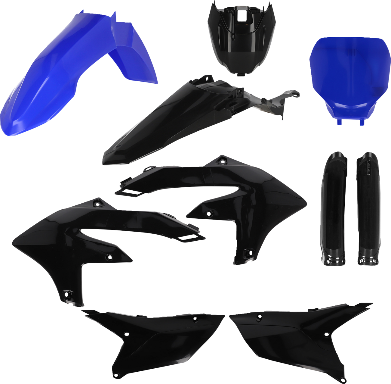 Full kit includes front fender, front number plate, lower fork cover set, radiator shrouds, side panels, and rear fender