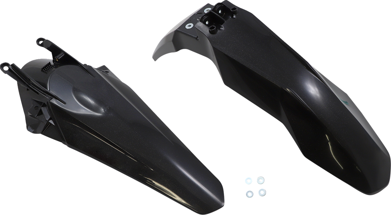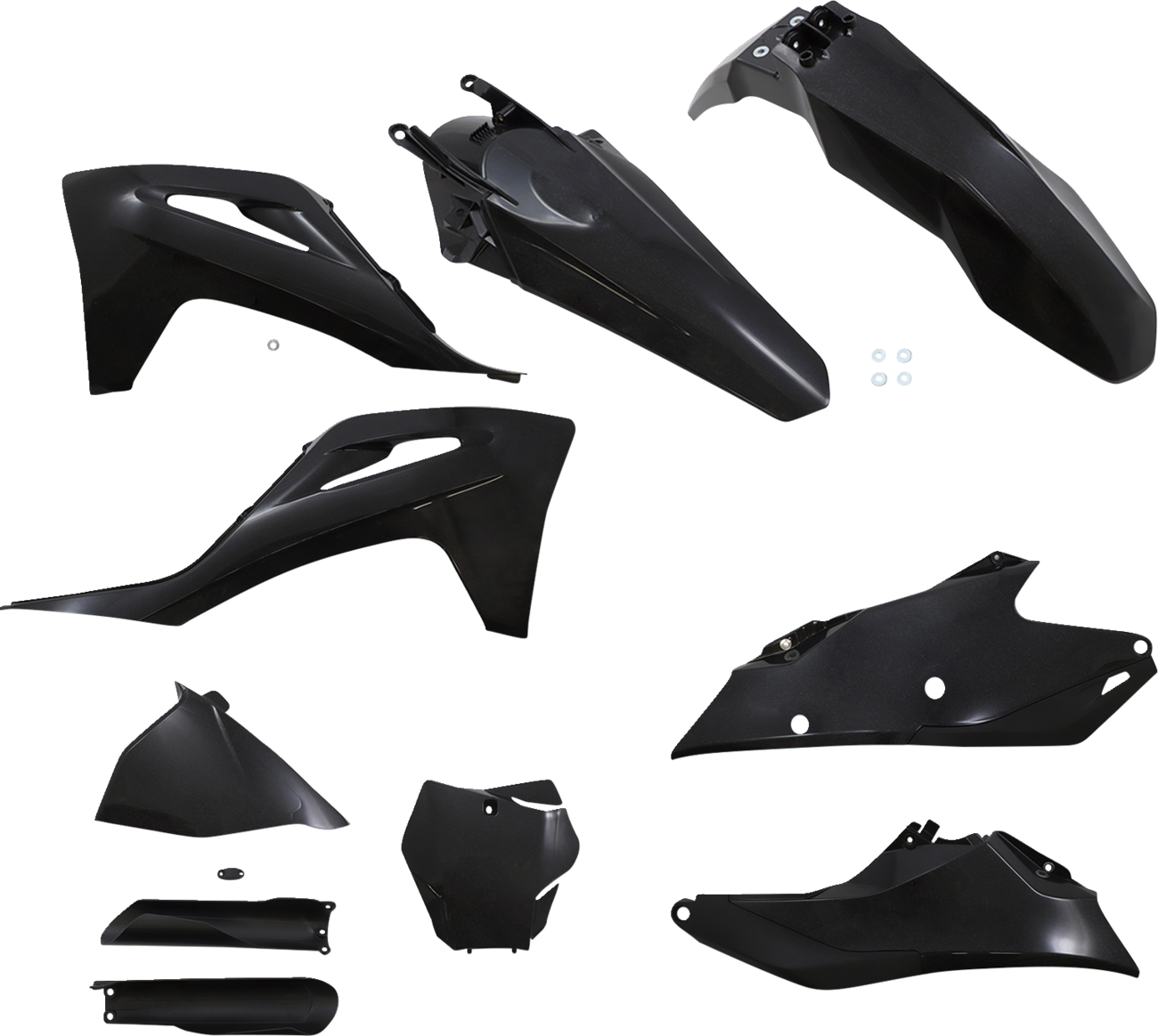 Full kit includes front fender, front number plate, lower fork cover set, radiator shrouds, side panels, and rear fender