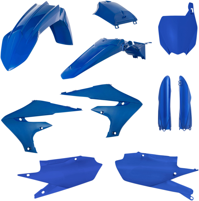 Full kit includes front fender, front number plate, lower fork cover set, radiator shrouds, side panels, and rear fender