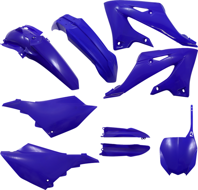 Full kit includes front fender, front number plate, lower fork cover set, radiator shrouds, side panels, and rear fender