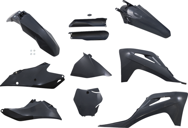 Full kit includes front fender, front number plate, lower fork cover set, radiator shrouds, side panels, and rear fender