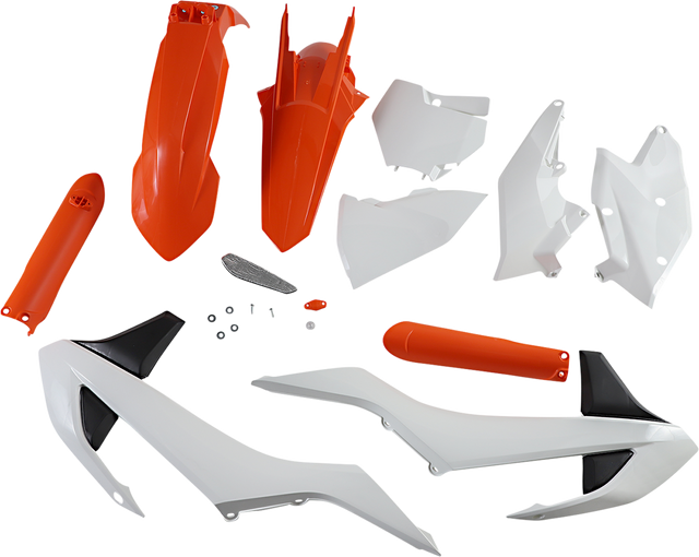 Full kit includes front fender, front number plate, lower fork cover set, radiator shrouds, side panels, and rear fender