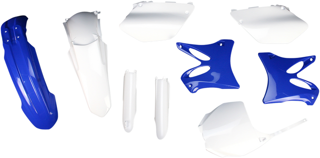 Full kit includes front fender, front number plate, lower fork cover set, radiator shrouds, side panels, and rear fender