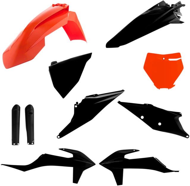 Full kit includes front fender, front number plate, lower fork cover set, radiator shrouds, side panels, and rear fender