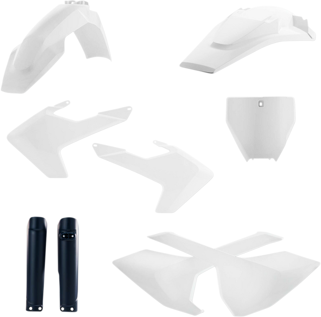 Full kit includes front fender, front number plate, lower fork cover set, radiator shrouds, side panels, and rear fender