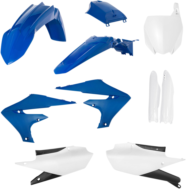 Full kit includes front fender, front number plate, lower fork cover set, radiator shrouds, side panels, and rear fender