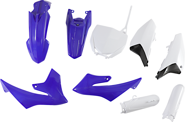 Full kit includes front fender, front number plate, lower fork cover set, radiator shrouds, side panels, and rear fender