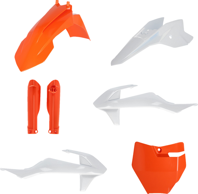 Full kit includes front fender, front number plate, lower fork cover set, radiator shrouds, side panels, and rear fender