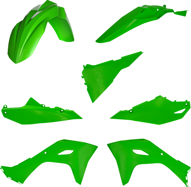 Full kit includes front fender, front number plate, lower fork cover set, radiator shrouds, side panels, and rear fender