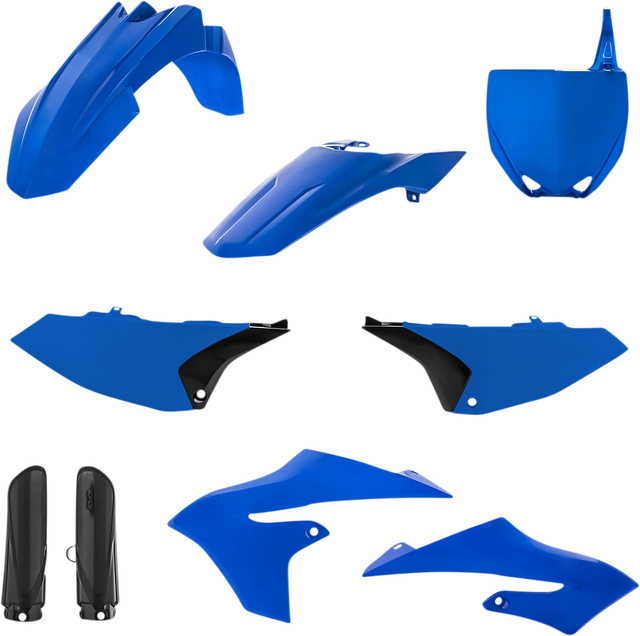 Full kit includes front fender, front number plate, lower fork cover set, radiator shrouds, side panels, and rear fender