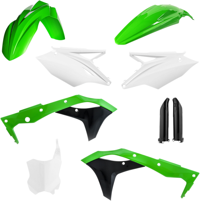 Full kit includes front fender, front number plate, lower fork cover set, radiator shrouds, side panels, and rear fender