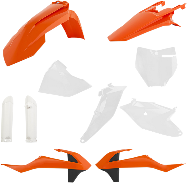 Full kit includes front fender, front number plate, lower fork cover set, radiator shrouds, side panels, and rear fender