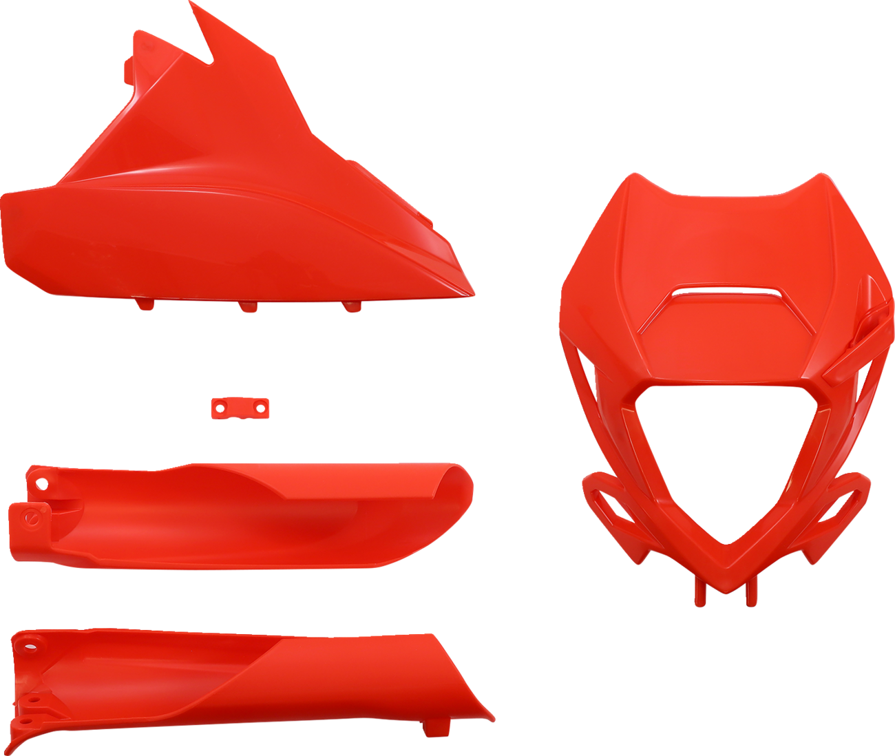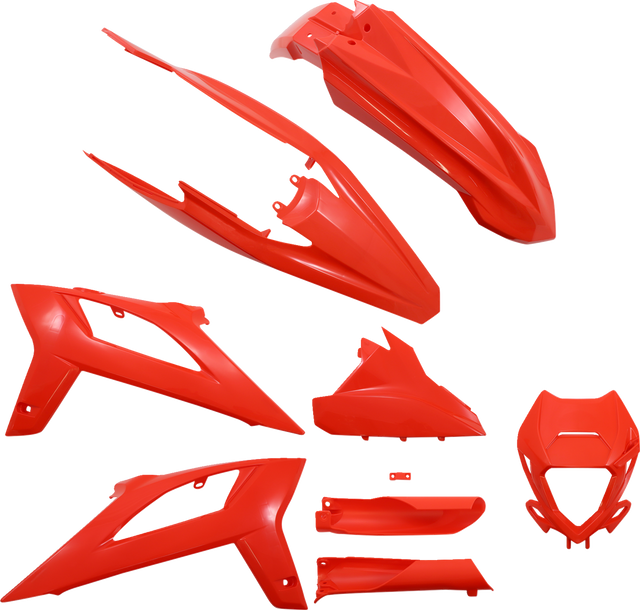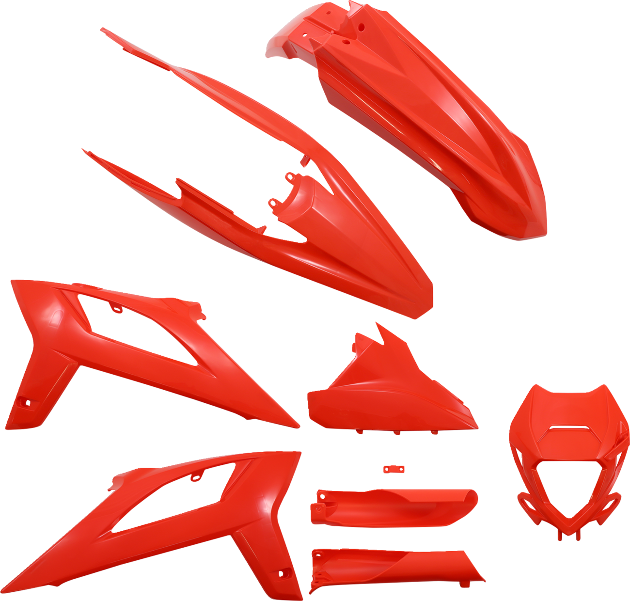 Full kit includes front fender, front number plate, lower fork cover set, radiator shrouds, side panels, and rear fender