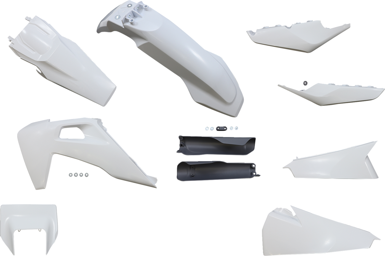Full kit includes front fender, front number plate, lower fork cover set, radiator shrouds, side panels, and rear fender