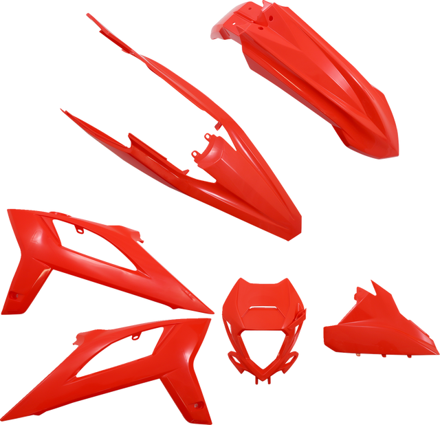 Full kit includes front fender, front number plate, lower fork cover set, radiator shrouds, side panels, and rear fender