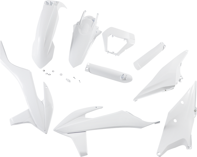 Full kit includes front fender, front number plate, lower fork cover set, radiator shrouds, side panels, and rear fender