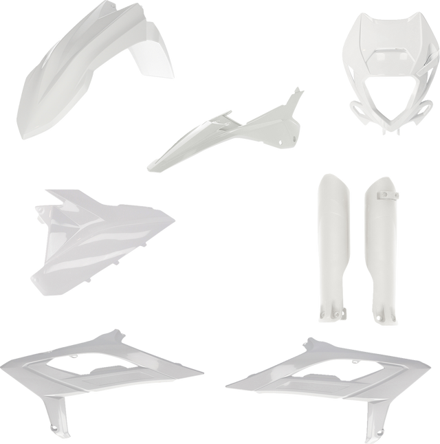 Full kit includes front fender, front number plate, lower fork cover set, radiator shrouds, side panels, and rear fender