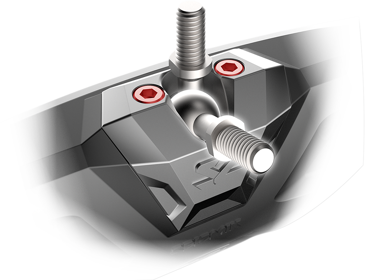 Locking block and bolts lock ball stud in place to prevent unwanted movement under the roughest condition