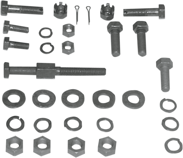 Includes two bolts, two bolts, two bolts, two nuts, two nuts, four nuts, two cotter pins, seven lock washers, one bolt, one adjusting screw and five washers