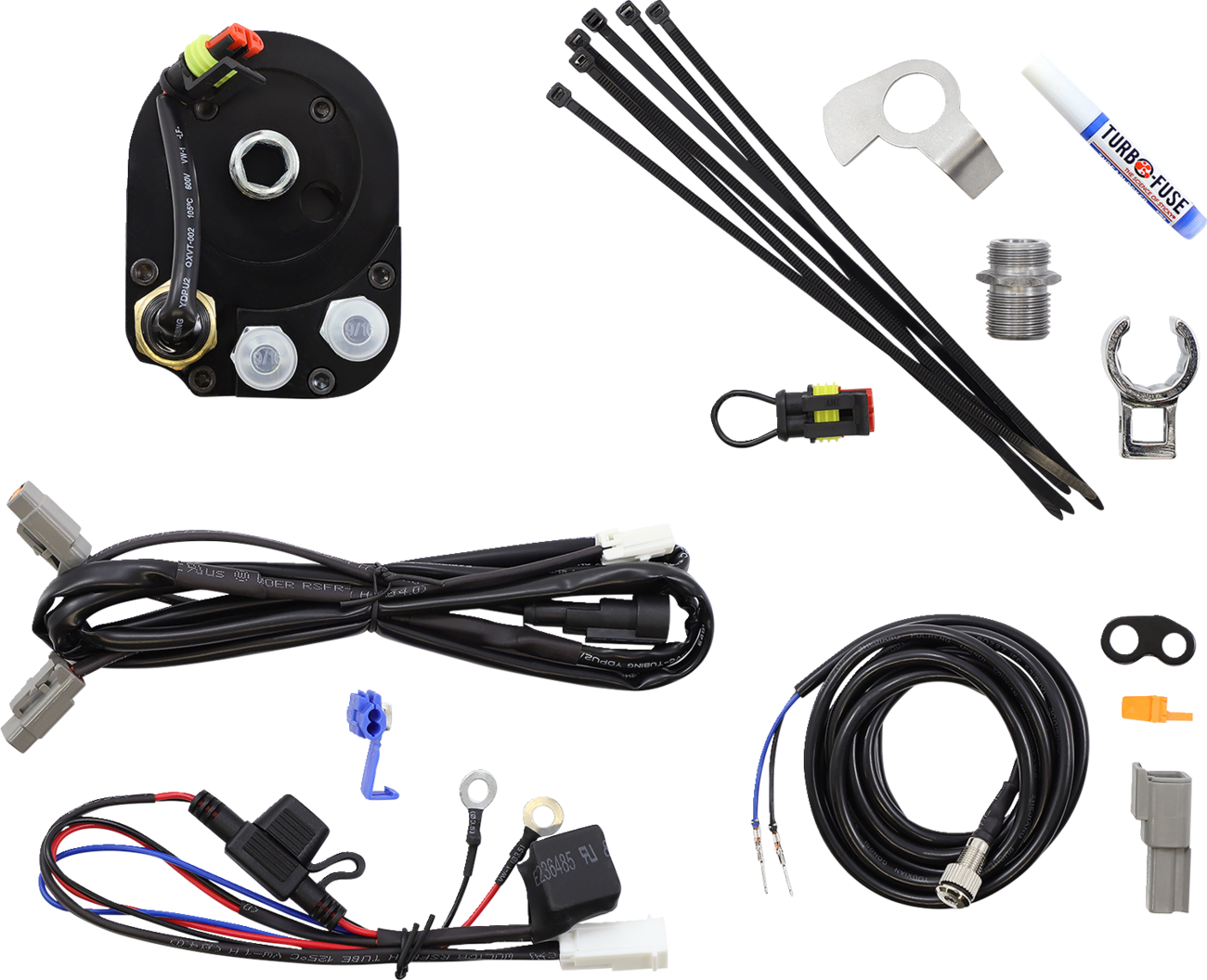 Plug-and-play wiring harness with relay and waterproof connectors that all connects to the battery under the seat for simple installation