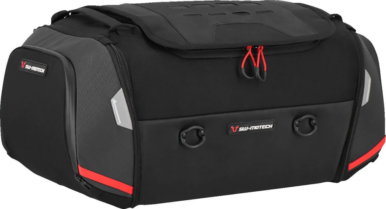 Anti-slip universal fit tail bag with large zippered mesh compartment, two outer zippered pockets, and volume expansion zippers on the outer sides
