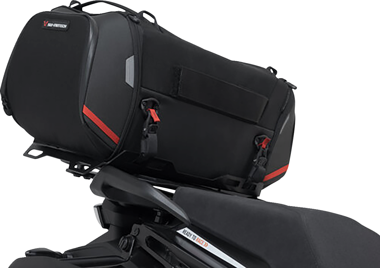 Anti-slip universal fit tail bag with large zippered mesh compartment, two outer zippered pockets, and volume expansion zippers on the outer sides